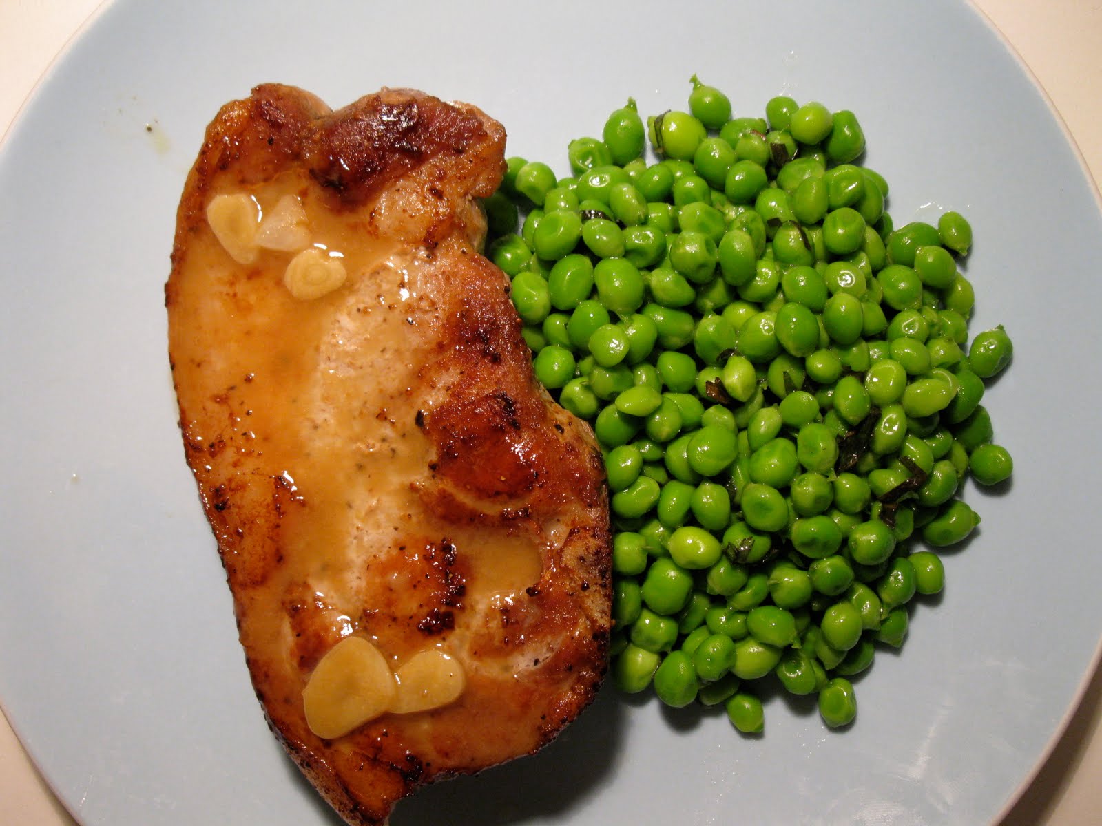 This was probably one of the worst pork chops ever cooked. It was tough and rubbery and what I had hoped would be a sauce, was instead a garlic oil spill. The peas were gently boiled and tossed with butter and chopped mint. I think they were trying to push the pork chop off the plate. The lighting is just unfortunate.